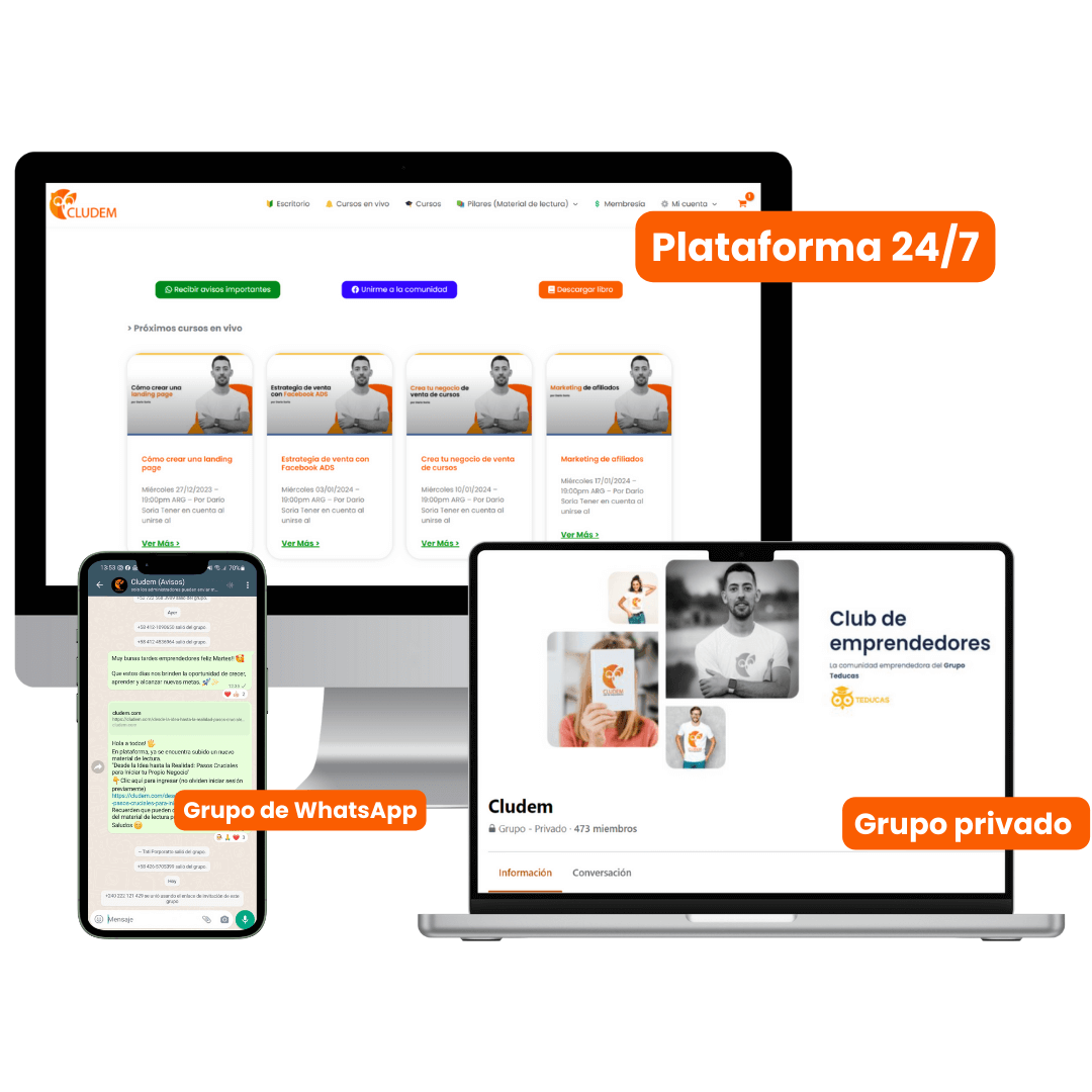 Ser parte de Cludem te permitirá acceder a TODO EL CONTENIDO de nuestra escuela para emprendedores. Si sientes que no conecta contigo podrás cancelar tu suscripción sin necesidad de aprobación nuestra. Nuestro objetivo es que puedas aprovechar al máximo todas las herramientas en tendencia y potenciar tus resultados.